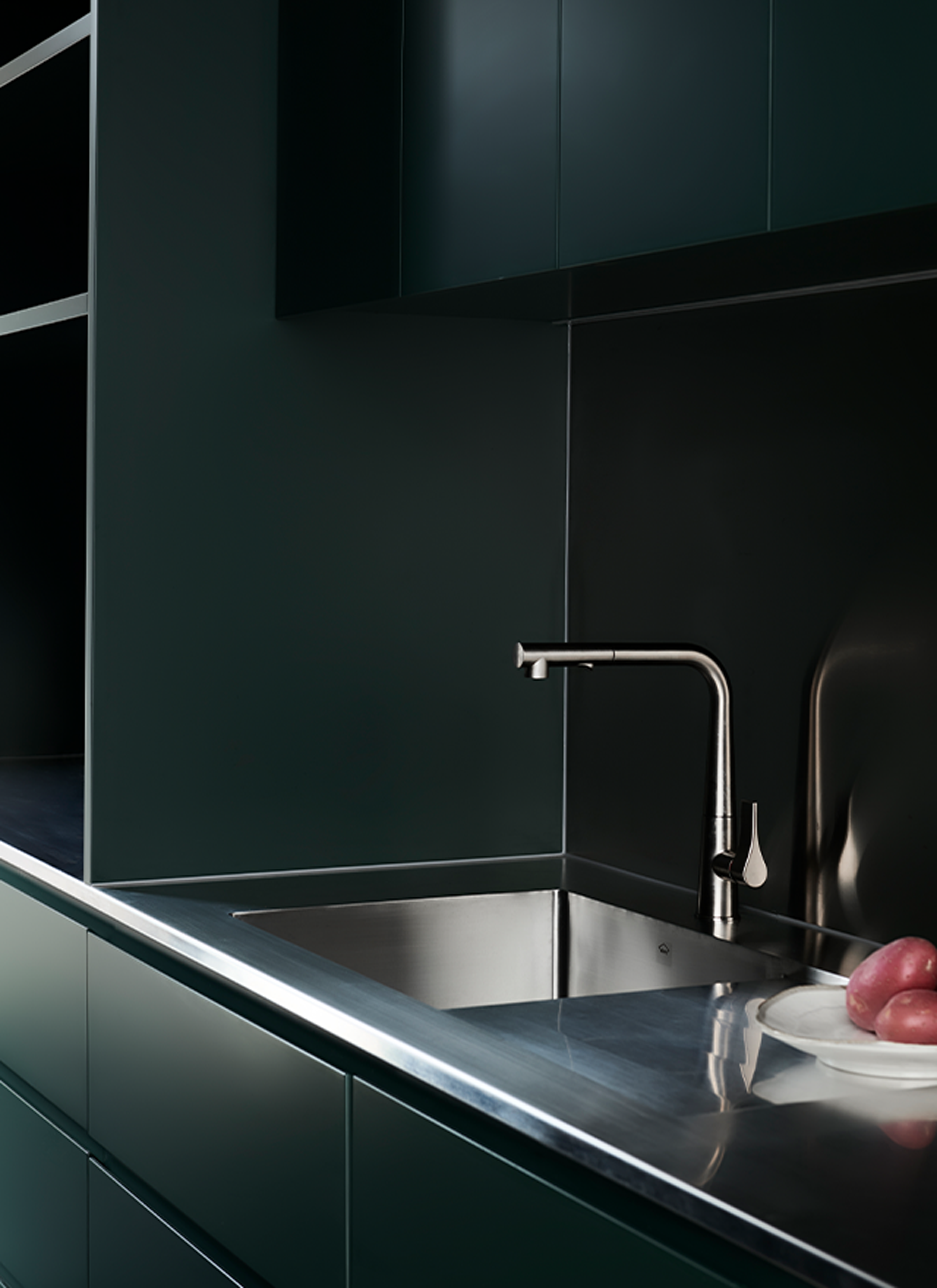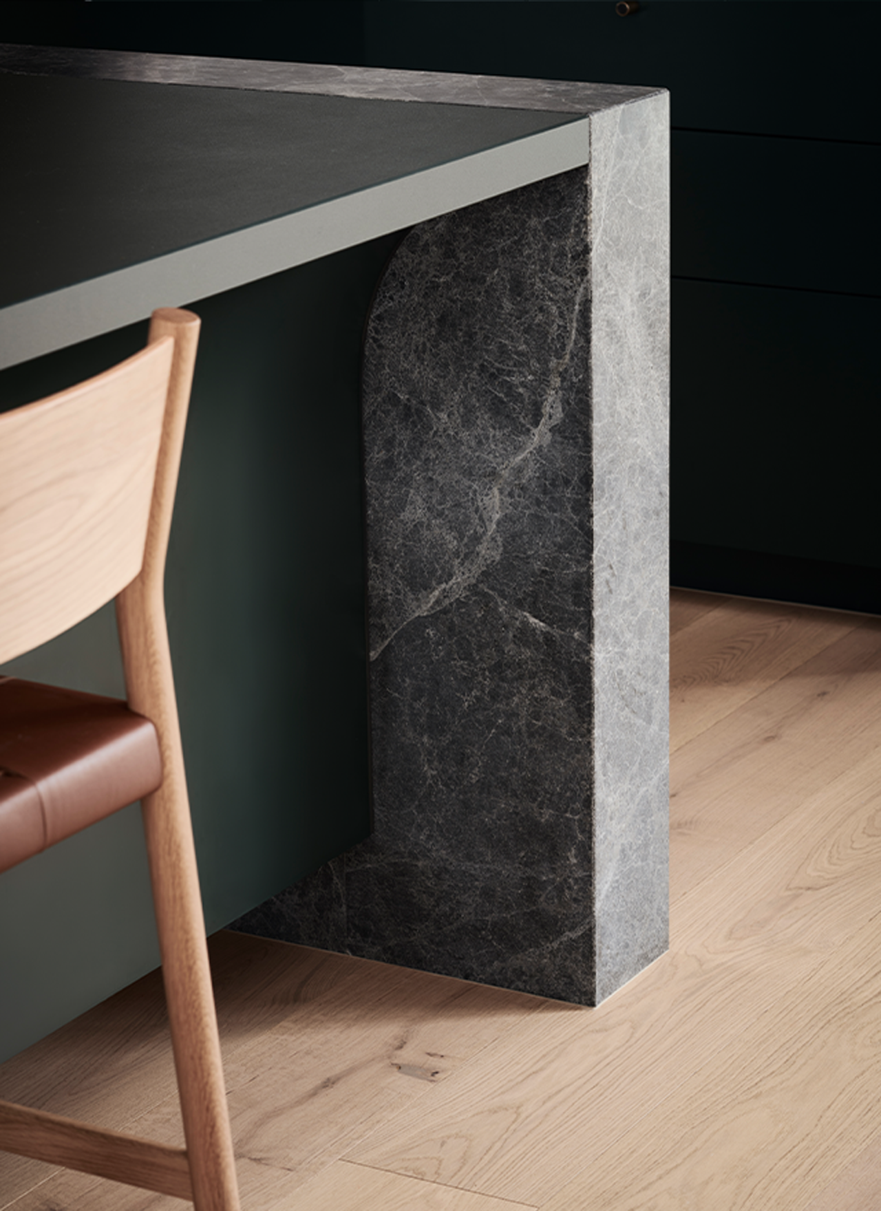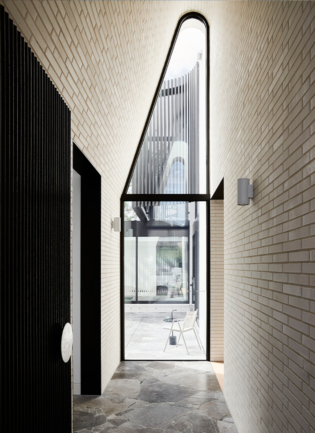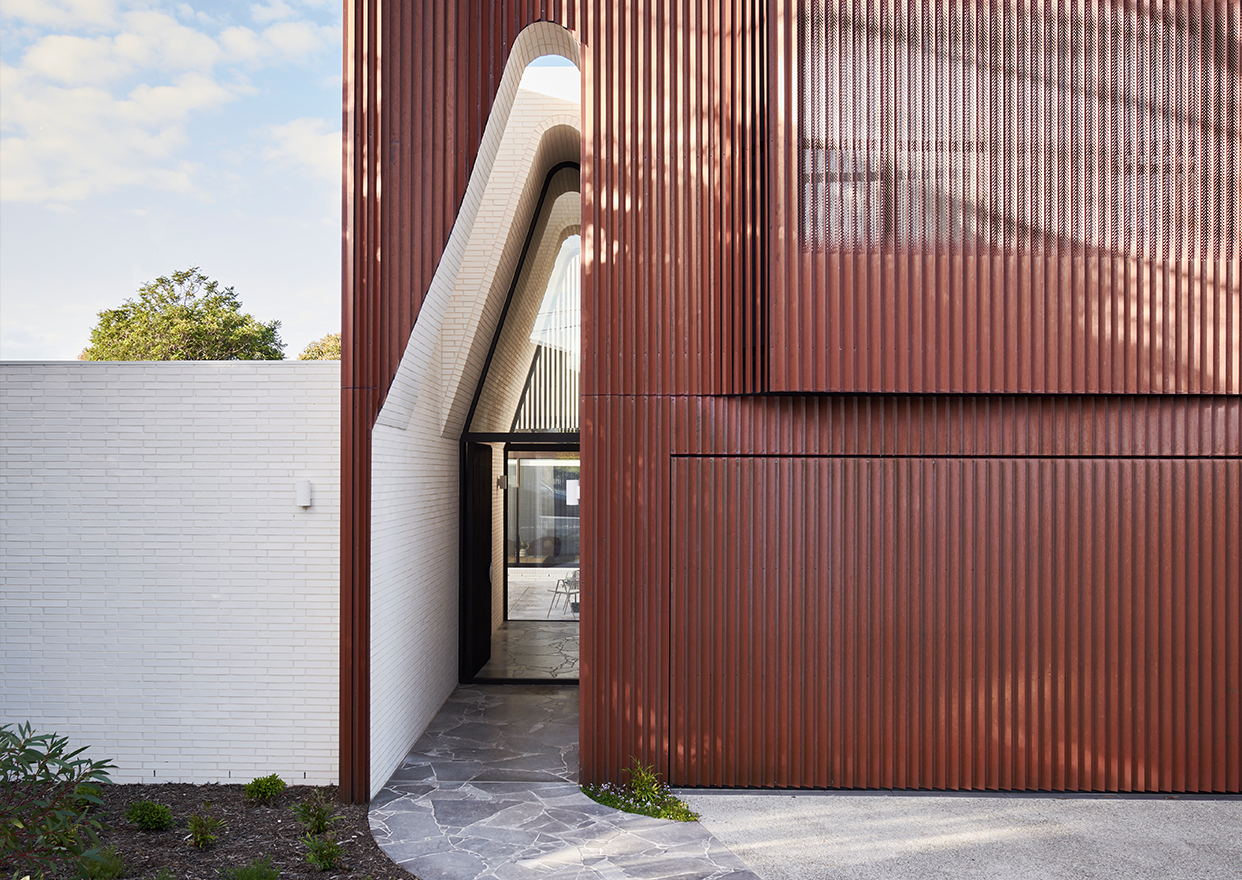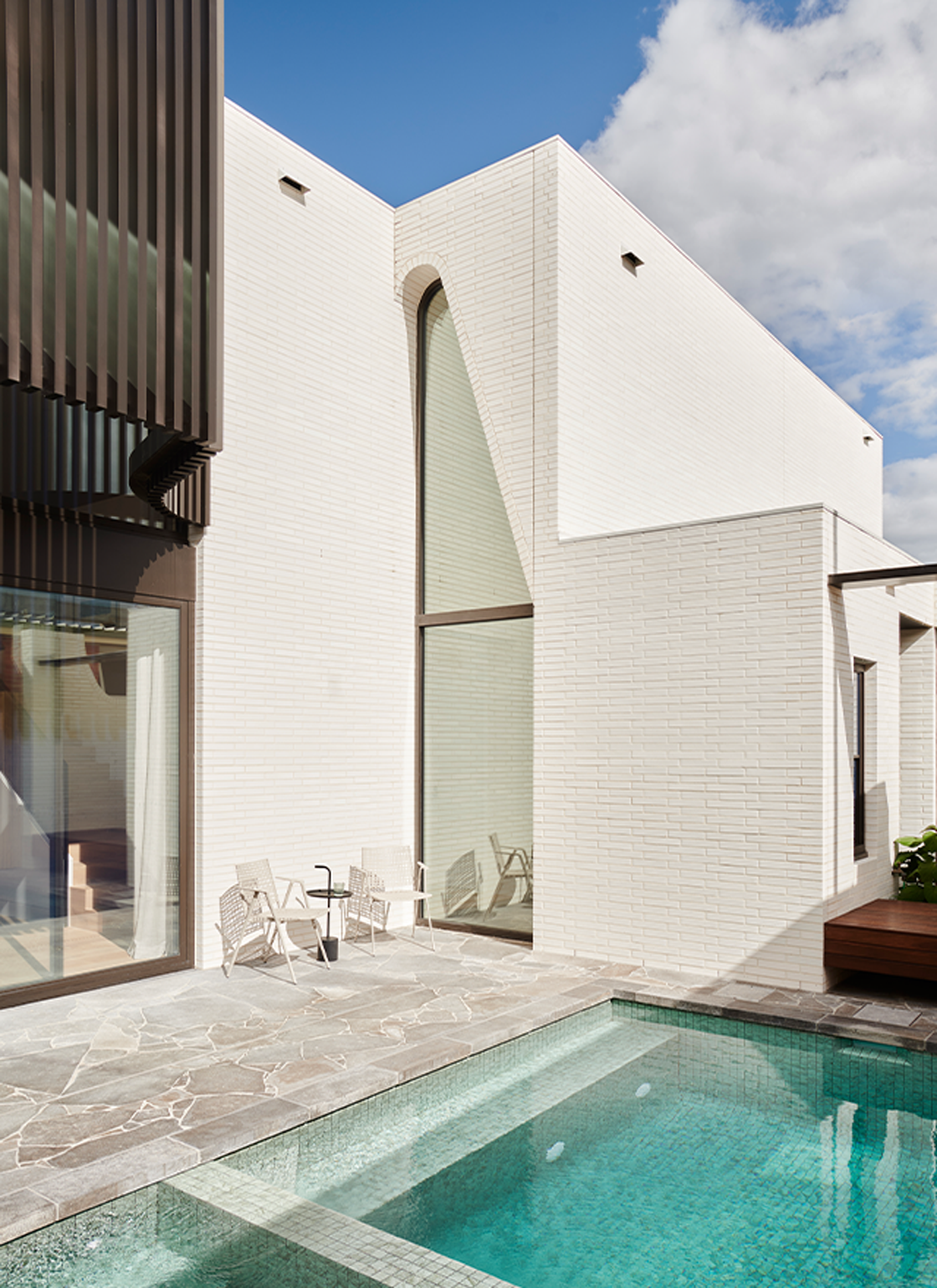 Double height glazing frames views across the emerald pool, linking the homes entry, dining and sunken living, fostering a sense of connectivity. The tranquil interior palette combining timber, natural stone, metal and porcelain, draws inspiration from the sites established, verdant landscape, and the broader, bayside fabric. The architectural palette seamlessly unites, with ivory brickwork, dark bronze structural and framing elements, and a unique pleated copper façade, employed to patina and bloom with eucalypt-green tones over time.